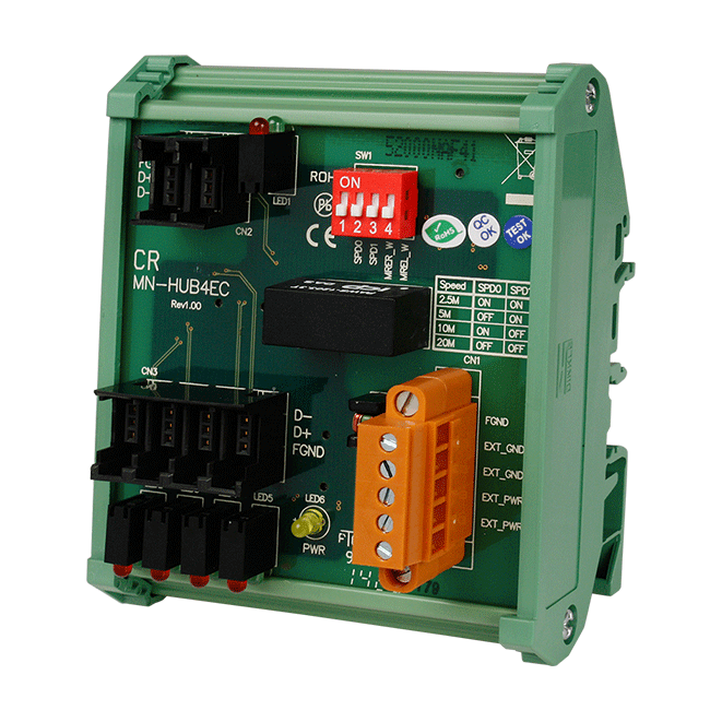 In some user’s application, users may encounter some difficulty in wiring since the standard Motionnet only support daisy-chain topology. The MN-HUB4EC module can help users to use star or tree topology during wiring which not only can make the wiring more easier but also reduce the total wiring distance and cost.