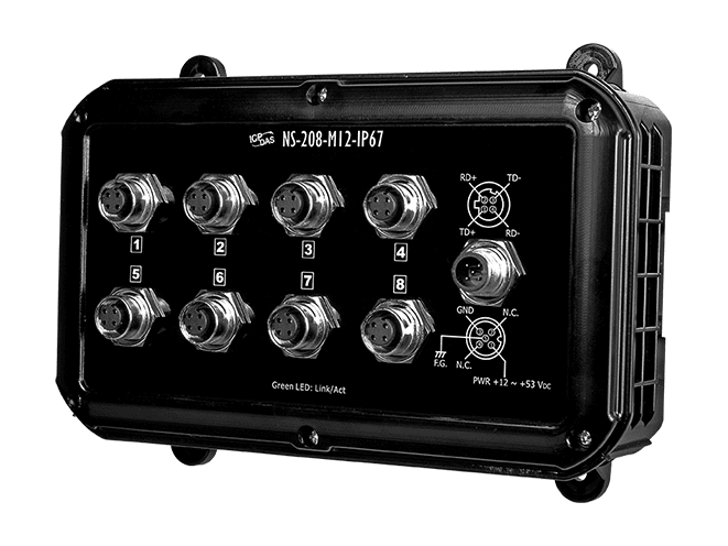 The ICP DAS NS-208-M12-IP67 provides a wide +12 VDC ~ +53 VDC power range to fit all the common power standards found in industrial automation, without external power converters, the wide power input reduces installation and maintenance costs.