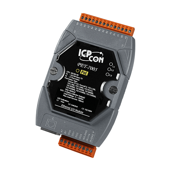 The PET-7005 also has 4-channel digital outputs for alarm output with Short-circuit protection and overload protection. The ICP DAS PET-7005 is equipped with Power over Ethernet (PoE) function and supports Modbus TCP protocol for seamless integration with SCADA software. Equipped with 2500 VDC intra-module isolation and 110 VDC/VAC over-voltage protection for thermistors makes the PET-7005 Ethernet IO module very reliable for resistance thermometer applications.