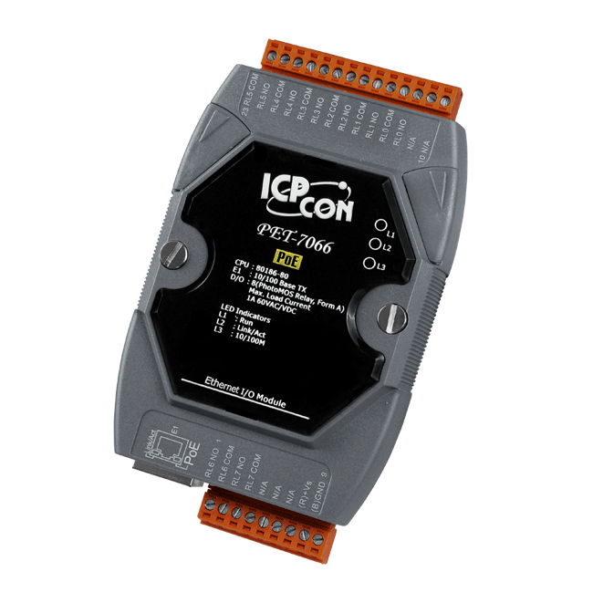 The ICP DAS PET-7066 provides 8 form A PhotoMOS relays with Power over Ethernet feature. It features optical isolation for 3000 Vrms of transient overvoltage protection and doesn’t have channel-to-channel isolation. The power-on value and safe value of the PhotoMOS relay are programmable. The ICP DAS PET-7066 can be safely used in applications where hazardous voltages are present.