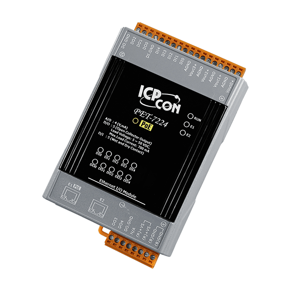 The ICP DAS PET-7224 is a multifunction module includes 4 channels analog output, 5 channels digital input and 5 channels digital output with Power over Ethernet. It provides a variety of programmable analog output options (+/-5 V, +/-10 V, 0 ~ 20 mA and 4 ~ 20 mA), and each analog output can be programmed to accept either current or voltage as output depending upon the position of corresponding jumper. The ICP DAS PET-7224 is fully RoHS compliant and provides 4 kV ESD protection as well as 2500 VDC intra-module isolation.