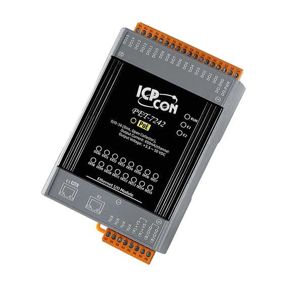 The ICP DAS PET-7242 provides 16 sink-type digital output channels with Power over Ethernet function. It features optical isolation for 3750 VDC of transient overvoltage protection and doesn’t have channel-to-channel isolation. The power-on value and safe value of digital output channel are programmable.