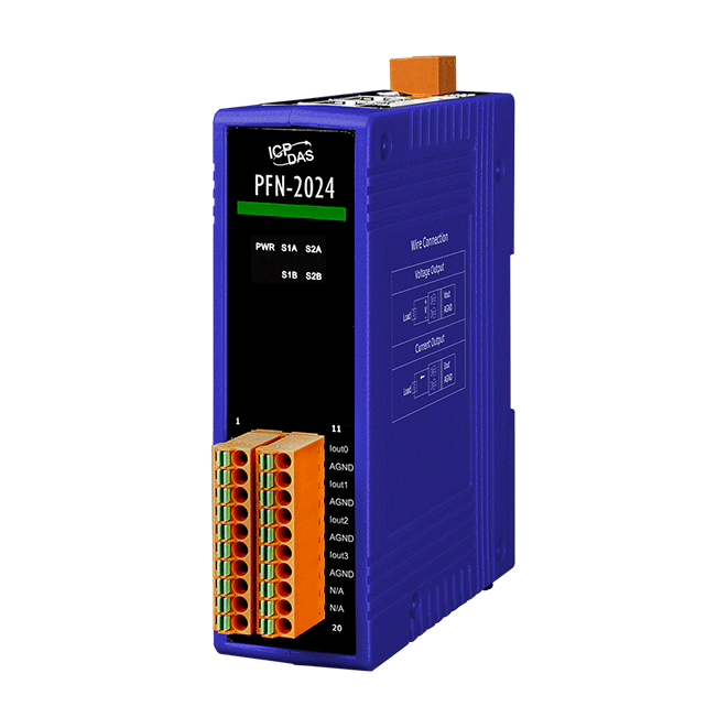The ICP DAS PFN-2024 is specially designed for PROFINET IO devices, equipped with 4-channel isolated analog output (i.e. voltage and current input types). The PFN-2024 provides ±4kV ESD protection contacting for all terminals. Users can access and configure the PFN-2024 by using the GSDML file in any PROFINET Engineering tool.