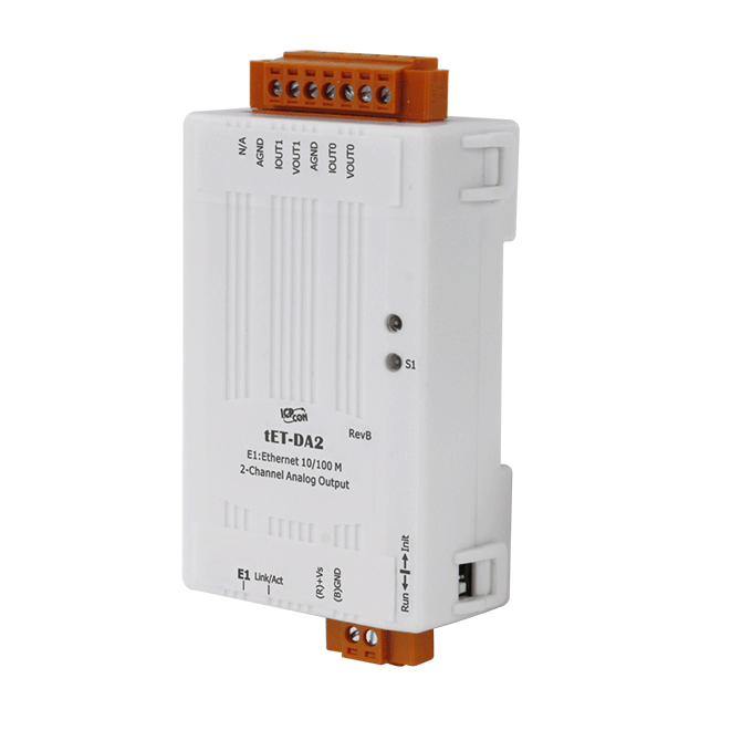 The tET-DA2 is a 2-channel 12-bit analog output Ethernet I/O module with a programmable output range on all analog outputs (0 ~ 10 V, 0 ~ 20 mA, 4 ~ 20 mA).