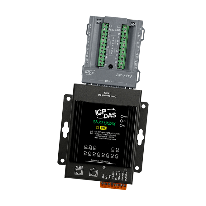 The ICP DAS U-7519ZM/S is an OPC UA I/O module that provides 10 analog inputs and 3 digital output channels. It has a built-in two-port Ethernet switch to implement daisy-chain topology. The cabling is much easier and total costs of cable and switch are significantly reduced. The ICP DAS U-7519ZM/S follows IEEE 802.3af compliant Power over Ethernet (PoE) specification. It allows receiving power from PoE enabled network by Ethernet pairs. This feature provides greater flexibility and efficiency to simplify system design, save space, and reduce wiring and power sockets. It provides a Web UI to configure/control/monitor the modules, connections, and I/O status via a web browser. It is easy, fast, and no extra APP needed.