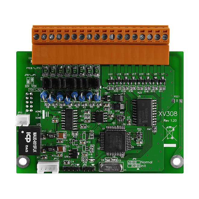 The ICP DAS XV308 provides 8 channels for analog input and 8 channels for universal digital input/output. Analog Input channels are Single-ended type and provide a programmable input range (±1 V, ±2.5 V, ±5 V, ±10 V, ±20 mA, 0 ~ 20 mA, 4 ~ 20 mA). Each Analog Input channels also provides a high over-voltage protection of 120 VDC. Universal digital input/output can be selected via wire connections. Digital input channels are source-type and can be used as 32-bit counters. Digital output channels are sink-type with short circuit protection and options for configuring power-on digital output values.